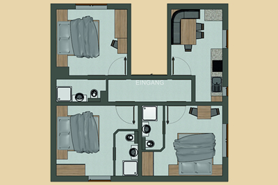 Unser geräumiges Apartment (61 m²) für 6 Personen ist wie folgt ausgestattet: